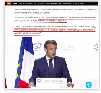 【译】我认为巴西人,一个伟大的民族,会对这种行为感到羞愧。”马克龙补充,“我和巴西人民有着很好的友谊,我尊重巴西人民,我希望他们能很快拥有一位称职的总统。”