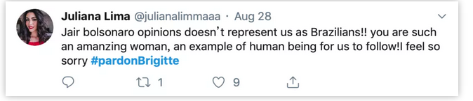 "Jair Bolsonaro opinions doesn’t represent us as Brazilians!! you are such an amazing woman, an example of human being for us to follow!I feel so sorry."
