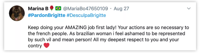 【译】(法国)第一夫人,请继续保持您杰出的工作!您的一言一行对法国人民不可或缺。作为一名巴西女性,我为这样尖酸刻薄的总统感到羞耻!我向您本人和法国表示最深的敬意。