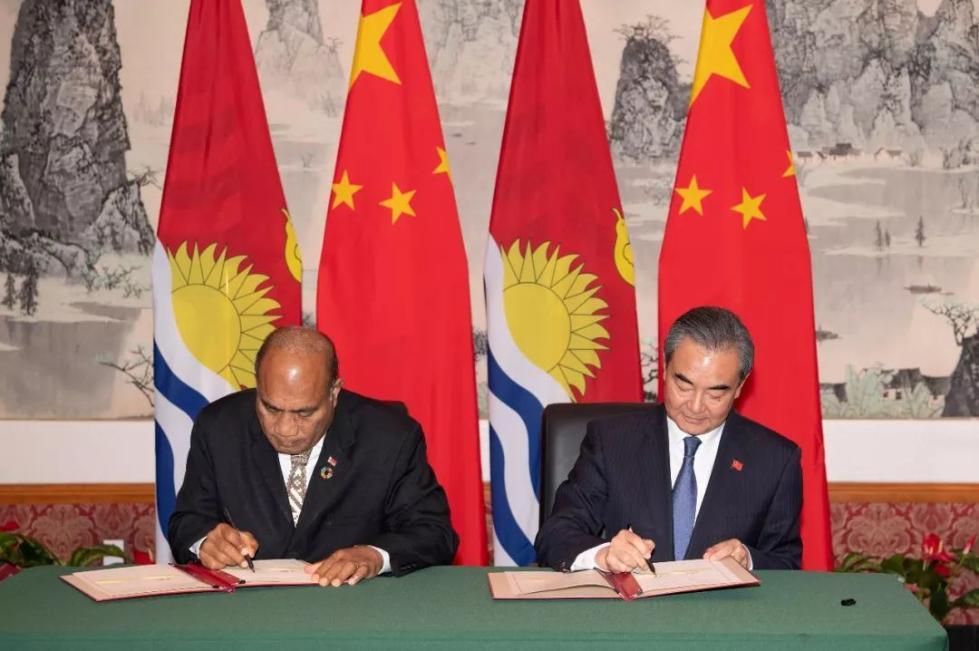 9月27日,中国国务委员兼外交部长王毅(右)在纽约中国常驻联合国代表团同基里巴斯共和国总统兼外长马茂签署《中华人民共和国与基里巴斯共和国关于恢复外交关系的联合公报》。 即日两国恢复大使级外交关系。
