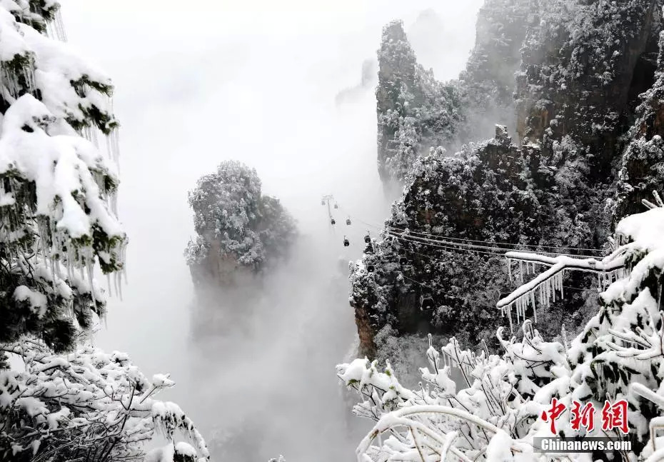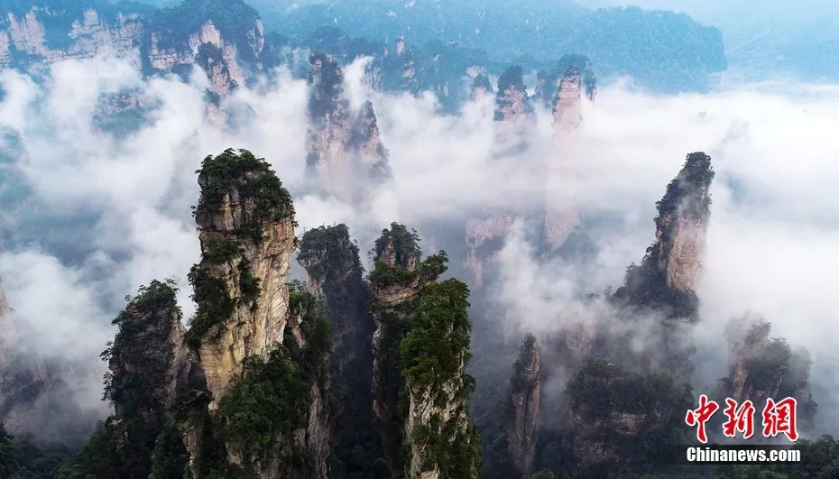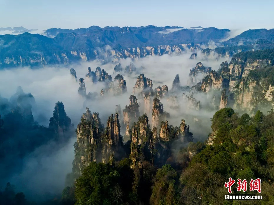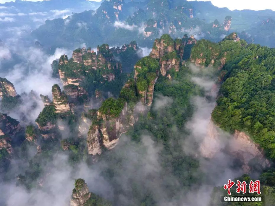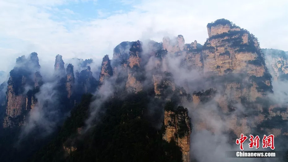 云雾围绕连绵峰峦,天门山仿佛“悬浮”空中。向韬摄