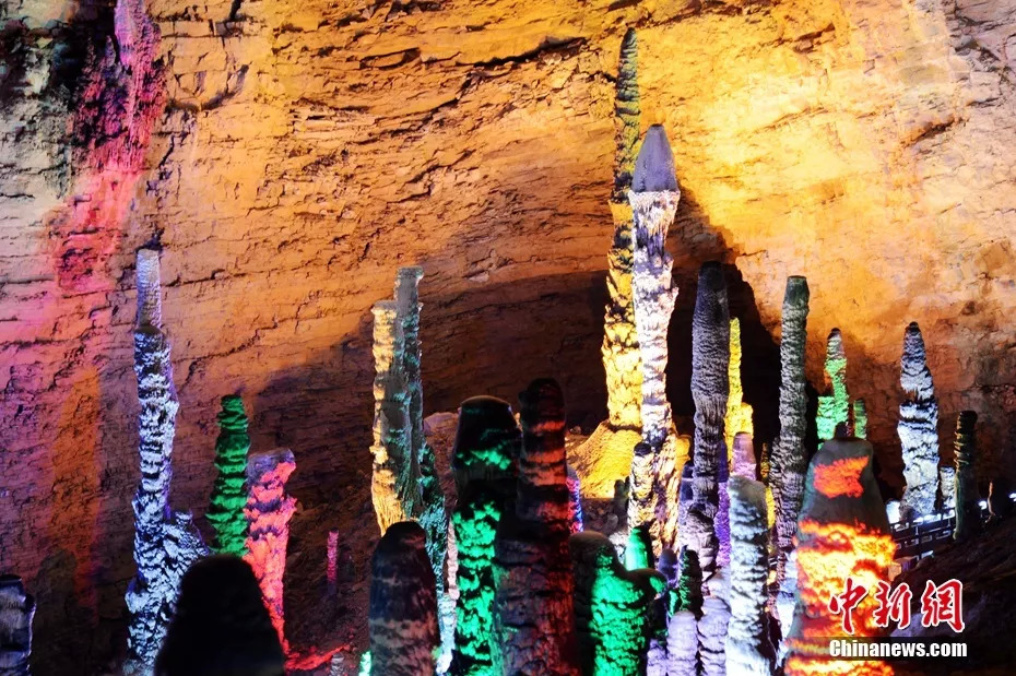 乘船进入山体腹地后,由石灰质溶液凝结而成的石钟乳、石笋、石花、石幔、石枝、石管、石珍珠、石珊瑚等跃入眼前,在各色灯光的照射下,仿若步入神奇的地下“魔宫”。