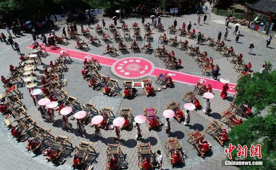 土家织锦工人在山水峰林间展示技艺。吴勇兵 摄