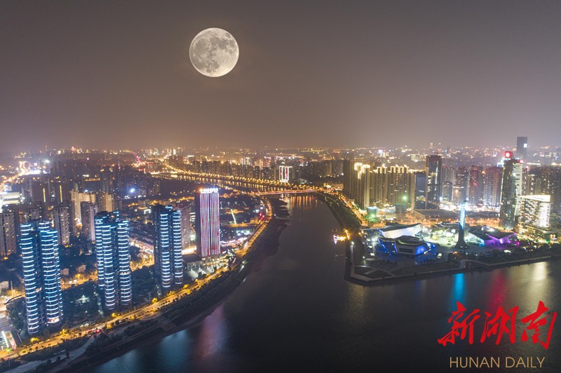 9月13日,农历八月十五中秋佳节,一轮皓月悬挂在长沙城区上空(两次曝光),美似画卷。湖南日报·新湖南客户端记者 李健 摄
