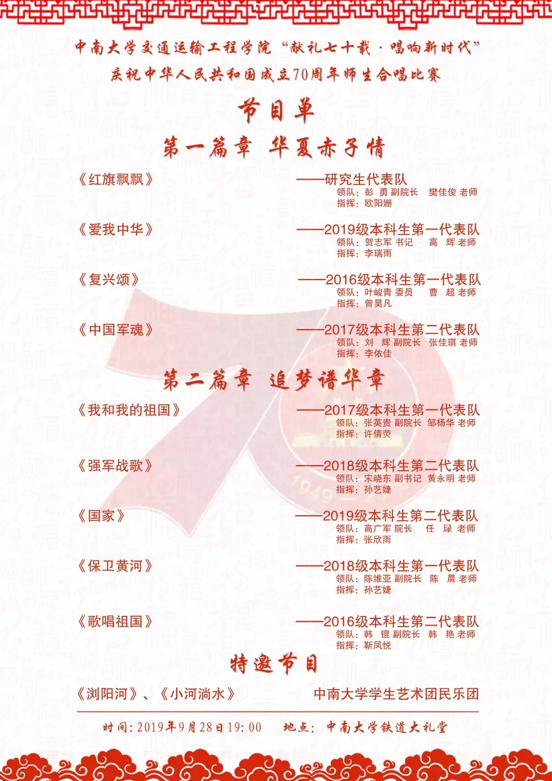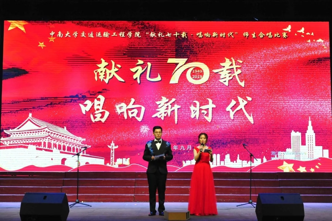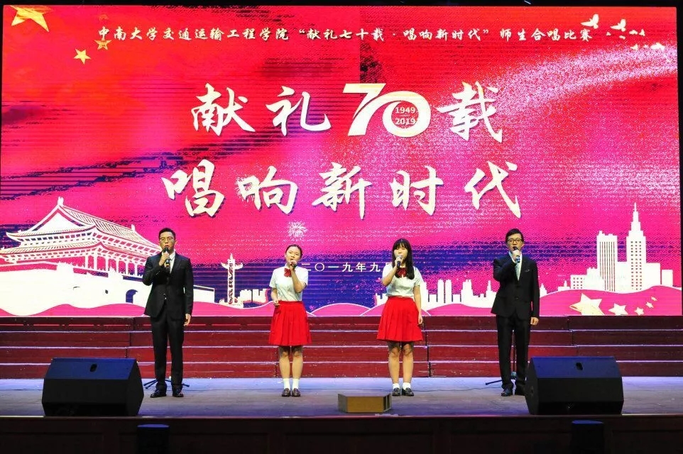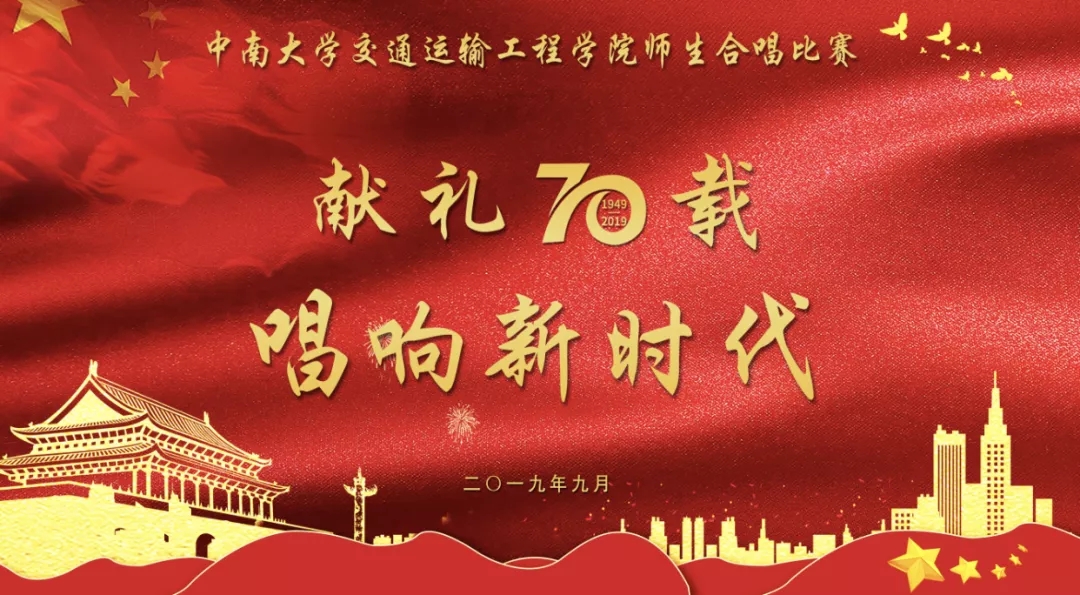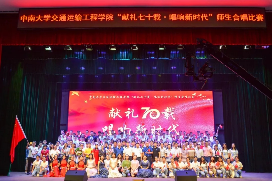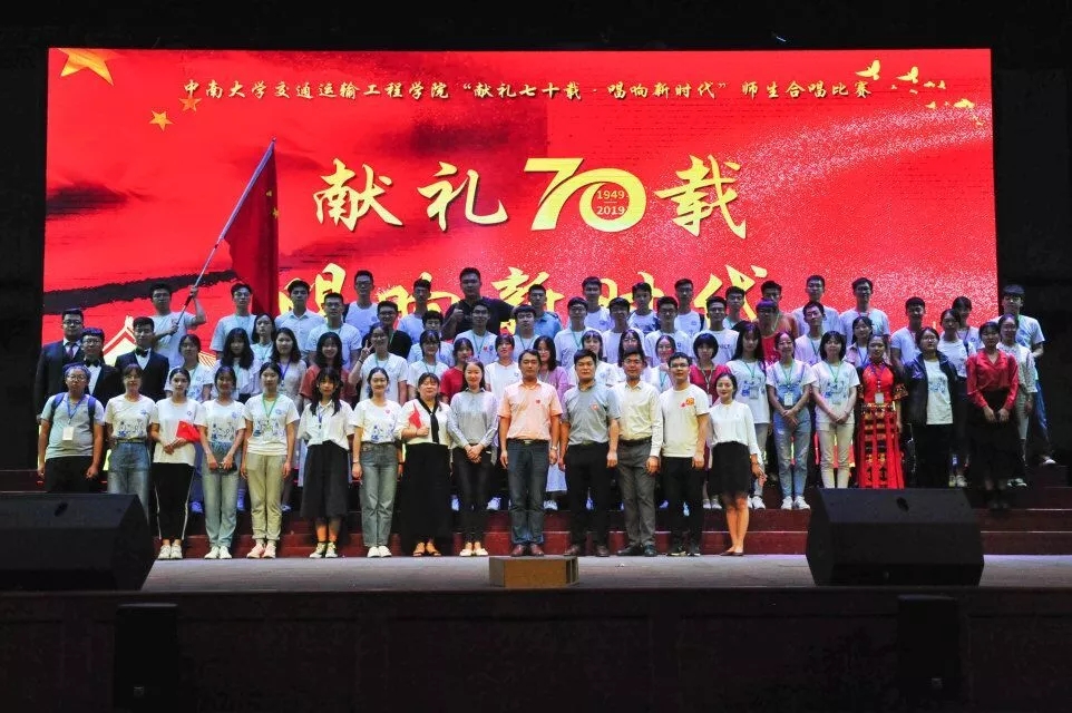 9 月 28日晚上7点,交通运输工程学院庆祝中华人民共和国成立七十周年合唱比赛,在中南大学铁道礼堂顺利举办,由全院本科生、研究生和教师代表组成的9个代表队共1100余人参加比赛。