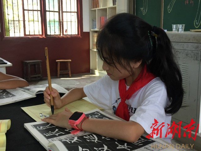 走进新化县金凤乡中心小学的书法室,学生们端坐在书案前,挥笔创作,挥墨徐书。“通过练习书法,我最大的收获就是心静了下来。”该校学生刘诺捷腼腆地说。