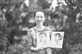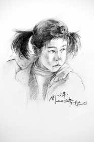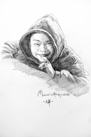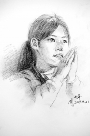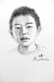 周文萍有一个习惯,她每看到一个有趣的瞬间,都会用相机拍下来。有一次,她看到班上有个小女生,头发上扎了3个辫子,便拍了下来。放学之后,她开始想把这张照片画出来。去年11月7日,这张素描画完了。