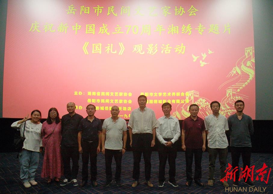 据了解,此次观影湘绣专题片《国礼》活动由湖南省民间文艺家协会、岳阳市文学艺术界联合会、岳阳市民间文艺家协会、湖南湘绣城影业有限公司主办,MC影城岳阳市新天地店(洛王)承办,旨在重温历史事件、弘扬传统文化,庆祝新中国成立70周年。