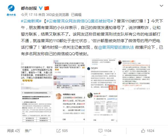 10月14日下午,在微信朋友圈、微博等网络平台上,不断有来自全国各地的网友表示,自己的微信、QQ被莫名其妙封号了。封号后还收到提示称,被封原因为“国务院打击治理电信网络新型违法犯罪工作部际联席会议办公室通报封停”。该提示还提供了解决方法,称如有疑问,请联系普洱市公安局刑侦支队,并附上地址和14个联系电话。有网友就此表示,封号后普洱刑侦支队所有公布的电话都打不通,就连普洱的110都处于全忙状态,“估计都是被突然停了微信号的用户把电话打爆了!”