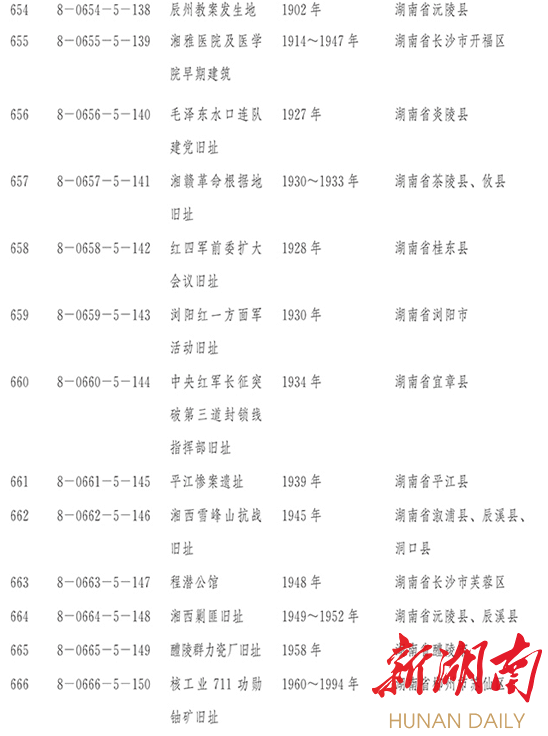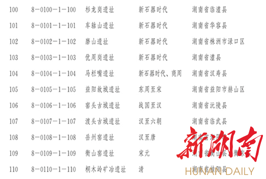 公布的第八批全国重点文物保护单位中,曾入选“2016年度全国十大考古新发现”的桐木岭矿冶遗址在列。临澧杉龙岗遗址为研究澧阳平原早期农业发展和社会形态提供了重要资料,此次也入选“国保”。湖南是革命文物大省,毛泽东水口连队建党旧址、湘赣革命根据地旧址、红四军前委扩大会议旧址、浏阳红一方面军活动旧址、中央红军长征突破第三道封锁线指挥部旧址、湘西雪峰山抗战旧址等入选。