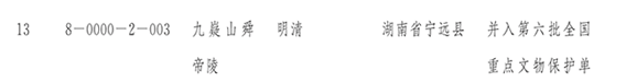 此外,九嶷山舜帝陵、罗荣桓故居增补点、秋收起义文家市会师旧址增补点、湘鄂赣革命根据地旧址增补点、湘鄂川黔革命根据地旧址增补点、黄埔军校第二分校十四军官总队旧址6处项目,与现有全国重点文物保护单位合并。