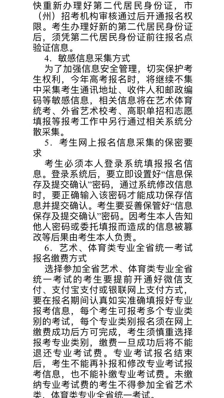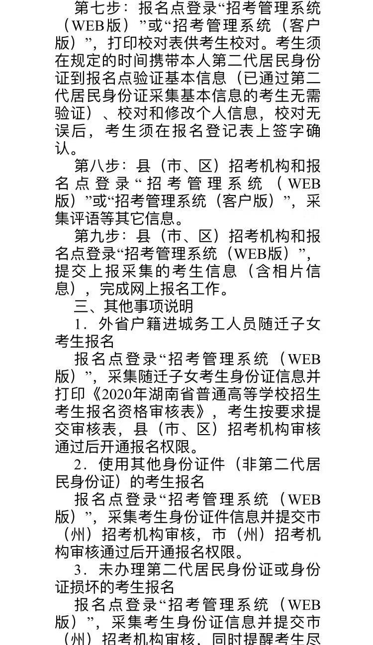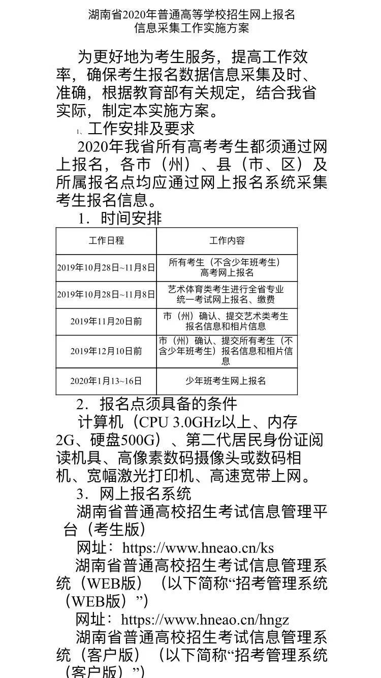 三湘都市报·新湖南客户端10月22日讯(记者 黄京)10月28日-11月8日,是我省明年高考报名的时间。今日,湖南省教育考试院公布《湖南省2020年普通高等学校招生网上报名信息采集工作实施方案》。根据《方案》,考生到报名点提交报名材料、缴纳普通高考报名考试费后,报名点对考生进行资格审查等工作,并将登录卡发放给相关考生。考生本人登录采集报名信息的网站,凭登录卡上的报名顺序号和密码,进入网上采集系统,按照有关要求输入本人的基本信息(身份证上的信息除外)。高考报名期间,考生可随时登录系统修改本人的信息,逾期不能再做修改。选择参加艺术、体育类专业全省统一考试(以下简称专业统考)的考生还须在规定的时间内上网填报好本人报考的专业考试类别、报考主辅项、考试期间联系电话等信息,并通过网上缴纳专业统考考试费,未在规定时间内完成专业统考网上缴费的,不能参加艺术、体育类专业全省统一考试。上网地点由报名点统一安排或考生自行选定。报名点及招考机构工作人员可即时上网查看报名进度等情况。