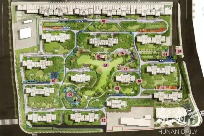 △园林布局:01北入口、02户外景观会客亭、03东入口、04入口台地跌水、05活动大草坪、06旱溪、07户外活动场地、08林下空间、09儿童活动区、10健康跑道、11休憩平台、12南入口、13休息平台