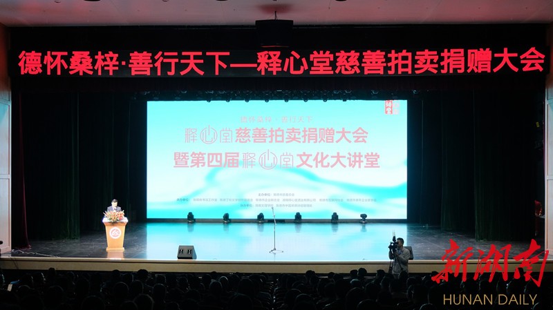 湖南日报·新湖南客户端10月19日讯(记者 李杰 通讯员 酉平平)德怀桑梓,善行天下。10月19日上午,释心堂慈善拍卖捐赠大会暨第四届释心堂文化大讲堂在湖南文理学院艺术中心盛大举行。活动现场,6副书法作品拍得善款32.8万元,全部捐献给常德市慈善总会释心堂慈善基金会。著名文化学者、北京师范大学文学院教授、博士生导师康震莅临大讲堂,主讲《传统文化与中国智慧》,为现场近千名观众送上一道精彩纷呈的文化盛宴。