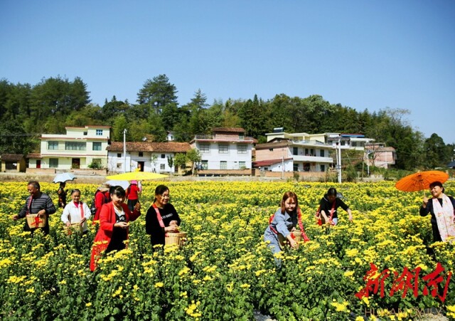 10月22日,桂东县普乐镇杨岭村,菊农和游客在采摘菊花。近年,该村把推进全域旅游和美丽乡村建设有机结合,发动村民种植可美化村庄,经济附加值又较高的黄金菊。时下,遍地盛开的菊花仿佛给大地铺上了一层金黄的地毯,吸引各地游客纷至沓来。邓仁湘 摄