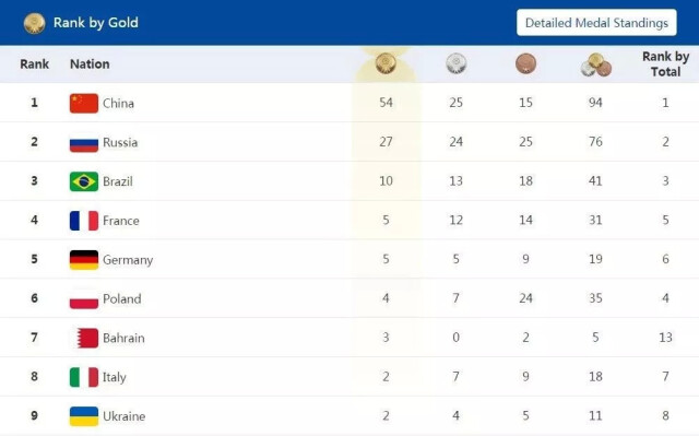 >军运会第四个比赛日过后,中国队以54金、25银、15铜的成绩继续领跑奖牌榜。