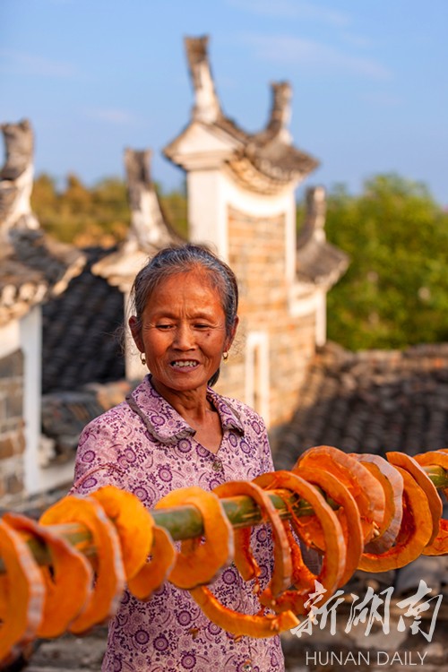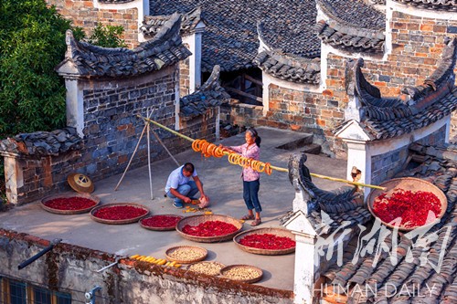 湖南日报·新湖南客户端10月11日讯(通讯员 唐明登 )10月10日,永州市东安县横塘镇文堂村群众趁着晴好天气,将收获的红辣椒、花生、南瓜、玉米、大豆晾晒在屋檐屋顶上,五颜六色的农作物与传统古民居交相辉映,构成一幅“晒秋”美景图,吸引了众多摄影爱好者前往观赏拍摄。