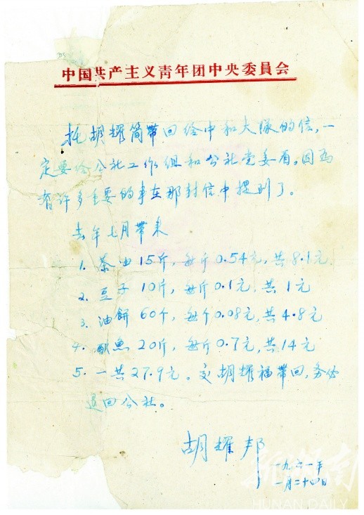 “去年七月带来:茶油15斤,每斤0.54元,共8.1元;豆子10斤,每斤0.1元,共1元;油饼60个,每个0.08元,共4.8元;熏鱼20斤,每斤0.7元,共14元;一共27.9元。交胡耀福带回,务必退回公社。胡耀邦,一九六一年一月二十四日。”
