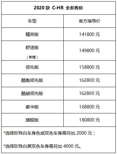 (2019年11月1日,广州)广汽丰田推出2020款C-HR,在原来入门版车型之上,新增舒适版车型,搭载TSS智行安全系统、电动天窗、智能钥匙、一键启动等高价值配置,为顾客提供更多元选择;同时C-HR领先版及以上主力车型版本均增配驾驶席10向电动座椅、全车高级皮质座椅等舒适便利配置,进一步升级高价值优势。