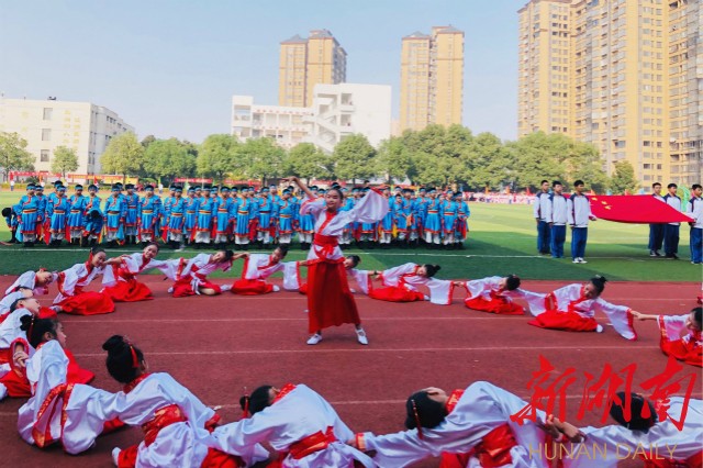 ▲松西子小学的同学们在运动会入场式上展示民族舞蹈