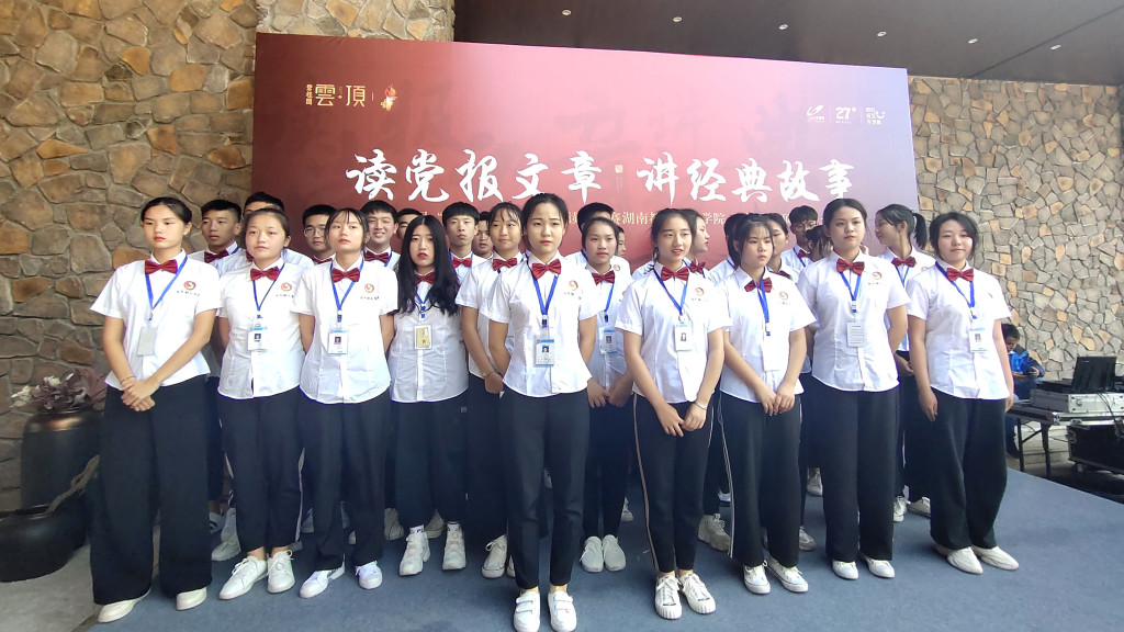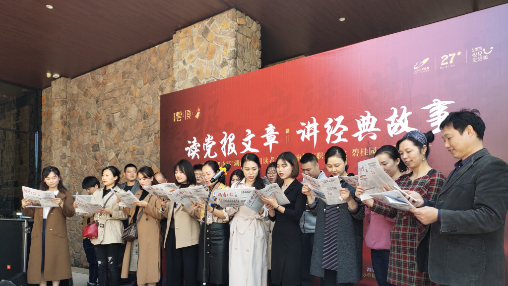 于是,碧桂园•云顶策划部钟瑶思立刻汇报给领导,在组委会的快速而又精心的策划下,节目单中多了一个特别的“加餐”,在座的全体成人以身作则,为同学们即兴朗读党报。20人,根据不同的单位分为6组,放学后代表、都市职业学院代表、碧桂园•云顶代表、家长代表、省邮政公司代表与湖南日报代表,由主持人带头,共同朗读党报文章《今日之中国 亦为世界之中国》。没有准备,没有彩排,一群并不熟知的成年人临阵磨枪。当朗朗读报声在云顶上空回旋时,热烈的掌声一次又一次响起来。