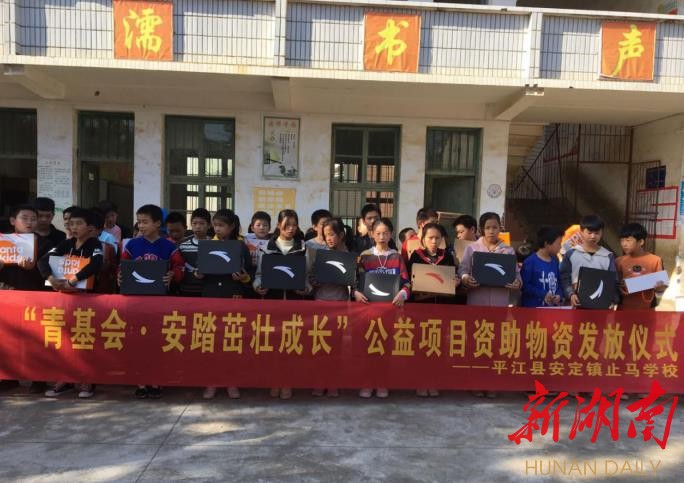 湖南日报·新湖南客户端11月16日讯(通讯员 童丹平) "哇,好漂亮的运动鞋,我好喜欢!”"我第一次穿这么好的运动鞋,实在太高兴了!”11月15日,平江县安定镇止马学校操场上一片欢声笑语。由共青团湖南省委、平江县委牵线搭桥的“青基会·安踏茁壮成长”公益项目物资发放仪式在这里举行。
