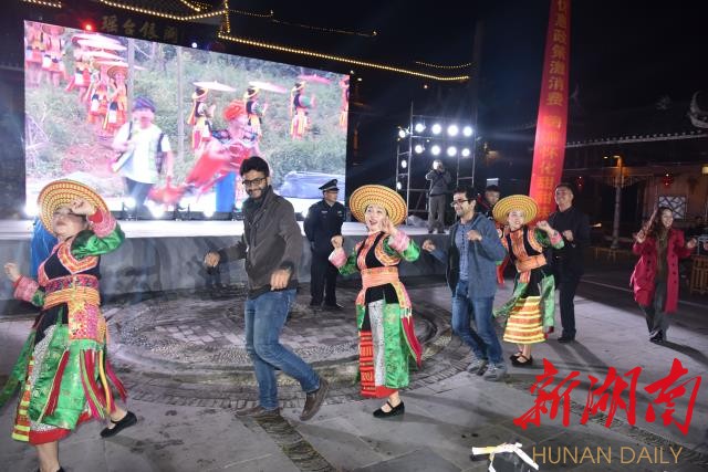 上图:11月21日晚,外国游客在枫香瑶寨与花瑶姑娘一起歌舞。