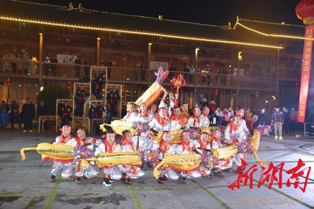 上图:11月21日晚,游客在枫香瑶寨赏民俗表演《板凳龙》。
