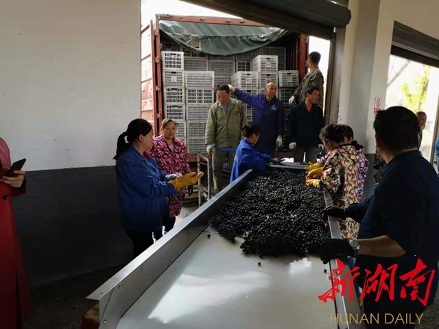 上图:11月3日,在湖南唯楚果汁酒业有限公司生产车间,工人们正在加工刺葡萄。