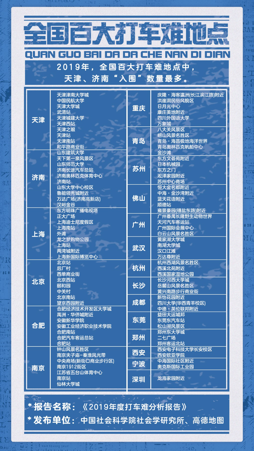 新湖南客户端12月16日讯(记者 秦慧英)有体验过高峰时段的“打车难”问题吗?在哪里最难打到车?今天,中国社会科学院社会学研究所与高德地图联合发布了《2019年度打车难分析报告》(以下简称“《报告》”),利用高德地图交通大数据、出行大数据和位置大数据,将城市道路路况、定位热度、应答率等数据维度综合研判,在全国20个主要城市综合研判出100个打车难地点,并深度解析国内主要城市重要地点的打车难情况,为人们出行提供参考。