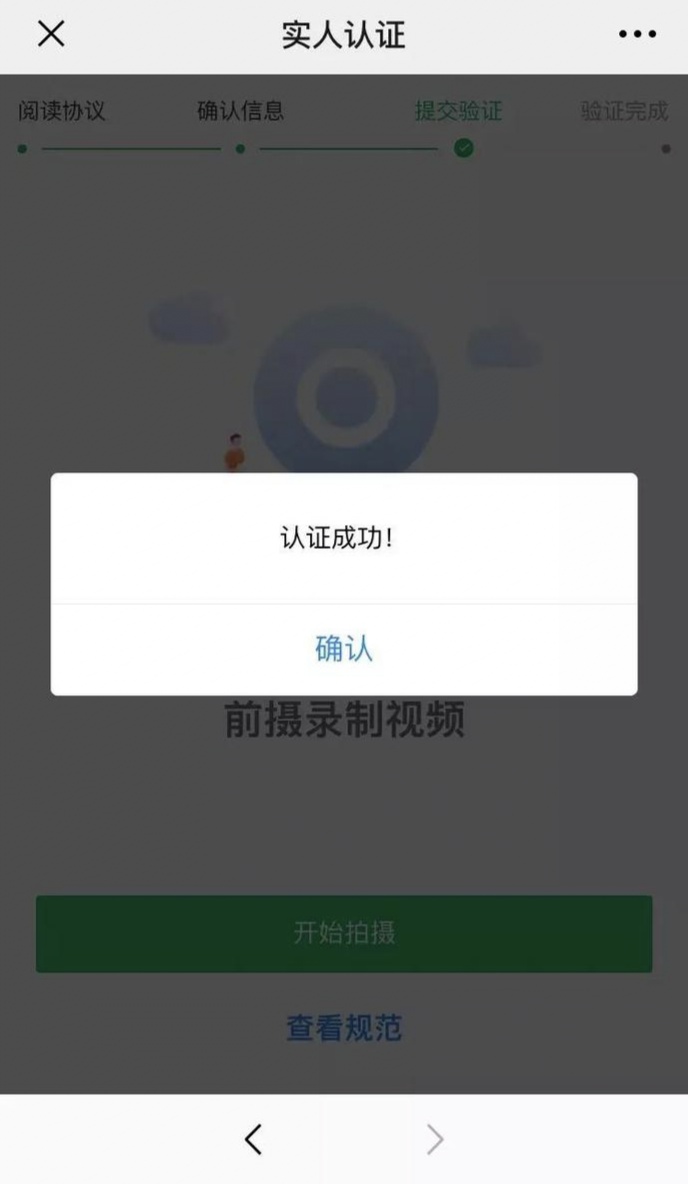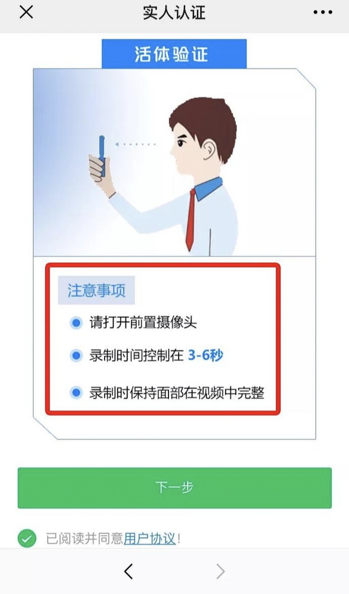 第三步:实人认证。返回【个人中心】,点击【实人认证】,首先阅读“注意事项”后点击【下一步】,系统会自动显示身份证号码和姓名,确认这两项基本信息无误后,再根据视频录制规范,录制3秒视频进行实人检测身份认证。