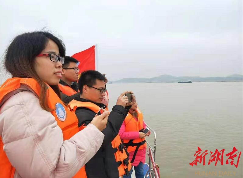 午饭过后,大家在协会“江豚姐姐”张脱冬带领下,怀着好奇心,冒着刺骨寒风来到洞庭湖飘尾水域寻找江豚。坐上巡逻艇来到湖心,一边听协会成员绘声绘色地讲述他们守护江豚的动人故事,一边用目光在雨后略显浑浊的湖面上,在往来穿梭的大小船只间搜寻江豚的踪迹,用相机记录下江豚出水瞬间的“丽影”。从协会成员的眼中,一众“笔杆子”读懂了他们作为一名环保志愿者的骄傲与自豪。通过此次探访,大家更加深刻领悟了正是因为徐亚平带领下的分社记者经常深入基层一线,才能写出那么多活灵活现的精彩细节,奉献出那么多可歌可泣的新闻故事。