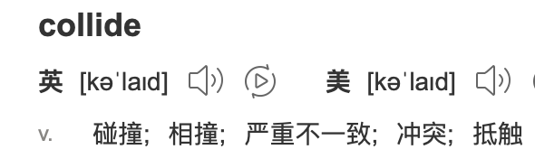 ② 作为 “意见不一致;冲突;抵制”,也是一个不及物动词,后面跟 with sb/ over sth。collide 除了“物理上的碰撞”,还可以表示 “不同观念、想法等的碰撞”。
