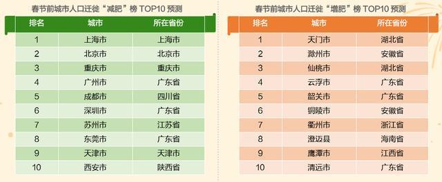 春节作为中国最隆重的传统佳节,大量外出务工人员都会选择返乡过年,与家人共享新年团聚的美好时光。从全国范围看,春节前人口迁出主要集中在长三角、京津冀、粤港澳大湾区以及山东、河南等省份;从具体城市的人口流动状况来看,上海、北京、重庆位列城市人口迁徙“减肥”榜人口迁出城市前三;湖北天门市、安徽滁州市、湖北仙桃市等城市位列人口迁徙“增肥”榜,城市春节期间人口增幅均超过150%。
