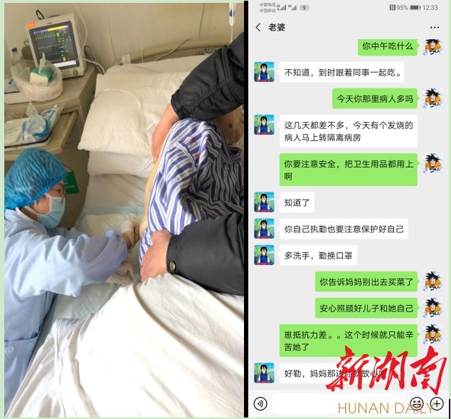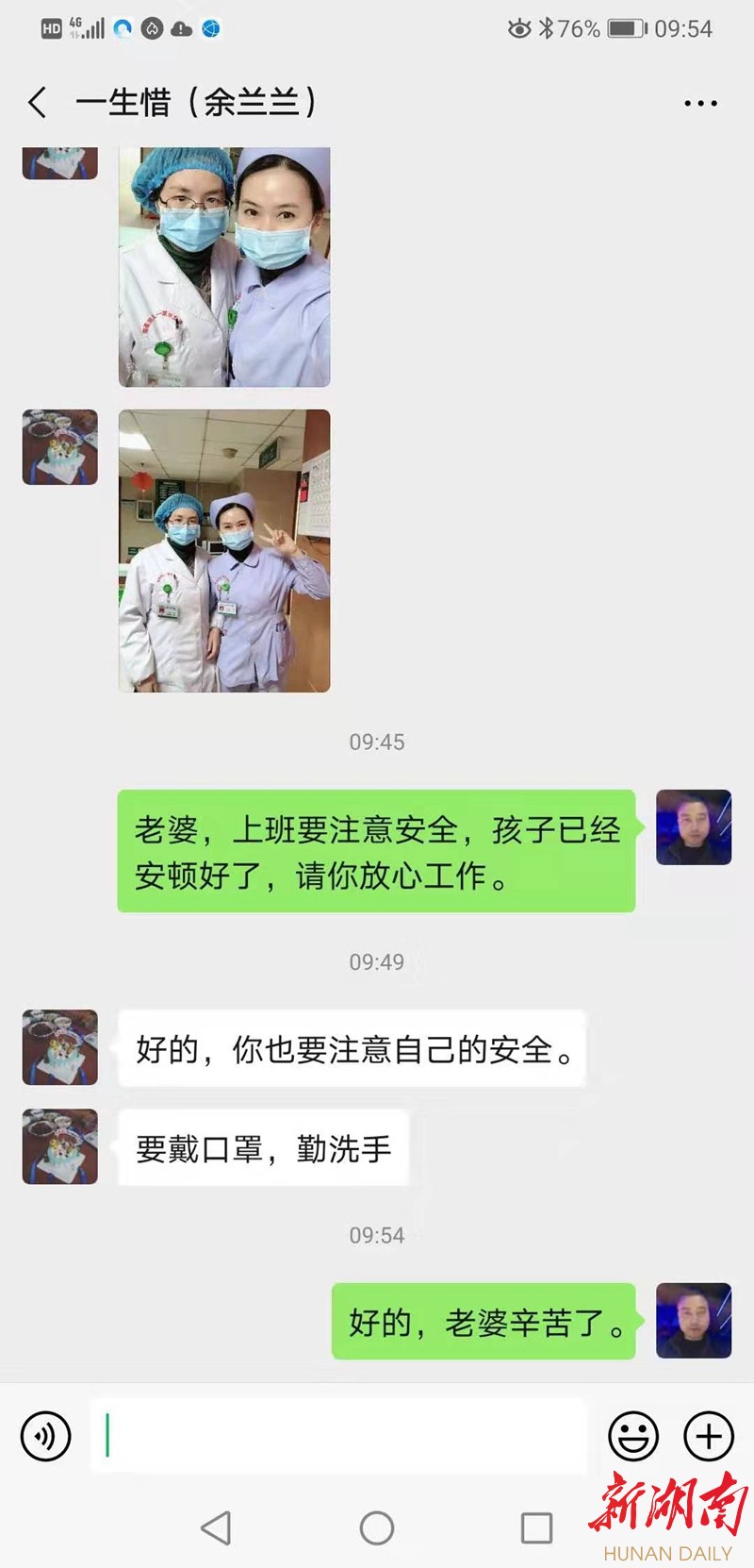 在抗击疫情的战役中,省高警局怀化支队芷江大队新晃中队中队长陈世明与妻子一起坚守在一线。不同的是,作为怀化市第一人民医院护士的妻子在医院抗击疫情,护理需要救治的病人。丈夫陈世明则是坚守在高速公路收费站的出口,对过往车辆进行第一步管控。微信对话中,陈世明对妻子满满的关爱,告诉她孩子已经安顿好了,安心地工作。