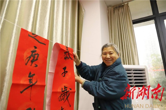 岳麓印社志愿者谭晓有着四五年送福写对联的经历,面对社区嗲嗲娭毑的期望,他一一应允将祝福付诸笔端。“看到这些爷爷奶奶拿着对联喜笑颜开的样子,我心里也是暖暖的。”谭晓说。