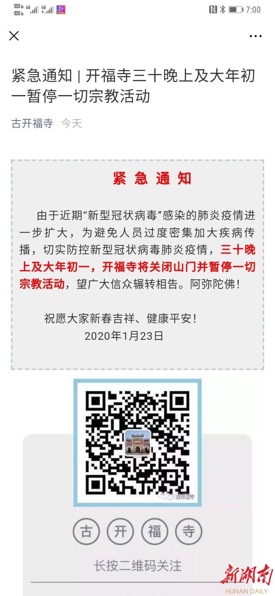 湖南日报·新湖南客户端1月23日讯(记者 张颐佳)记者刚刚从开福区民族宗教事务局获悉,由于近期“新型冠状病毒”感染的肺炎疫情进一步扩大,为避免人员过度密集加大疾病传播,切实防控新型冠状病毒肺炎疫情,开福区暂停春节期间所有宗教场所活动。