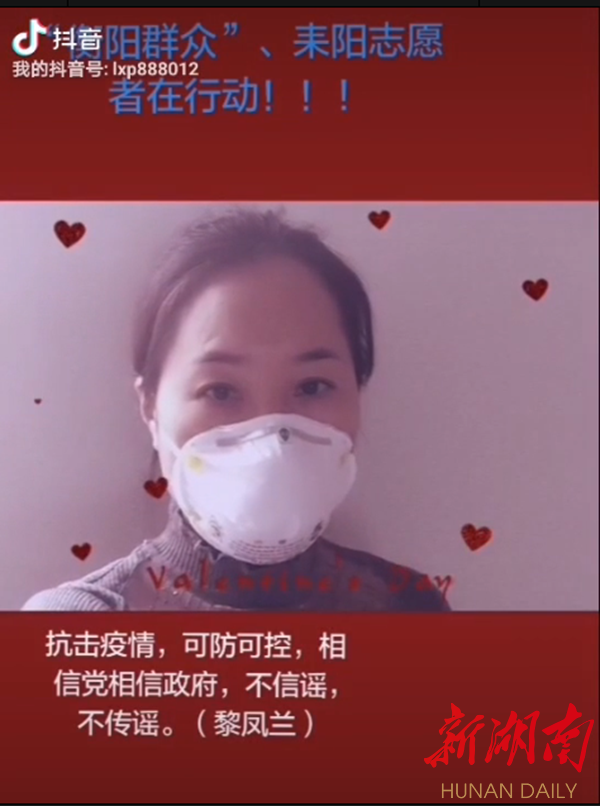 湖南日报·新湖南客户端1月29日讯(通讯员 梁小平 记者 聂沛)“我是耒阳‘衡阳群众’志愿者,大家好!防控疫情进入一级响应,请大家网络拜年,不出门,不聚会,讲卫生,戴口罩,勤洗手!”1月27日,耒阳“衡阳群众”志愿者黎凤兰将自制的15秒防疫短视频发布在朋友圈,一时间获得无数点赞与好评。