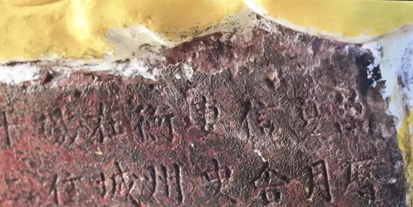 由于年代久远,字迹污损,初略辨认部分内容为:“万历乙酉夏月吉日,信舍刘照妻史氏……喜捨正佛一尊镇塔……”由此更进一步断定此佛像为明代建造。