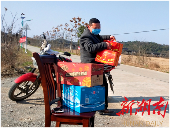 1月29日下午3时,桃源县浔阳街道教仁村路口值守点突然驶来一辆摩托车。执勤人员刚想上前劝返,只见摩托车主迅速把车后的物品往下搬,他边搬还边说:“你们是最辛苦最勇敢的人,给你们送点东西过来,感谢你们的付出。”然后又骑着摩托车一溜烟地跑了。执勤人员来不及好好感谢他,只匆匆拍下一张照片。
