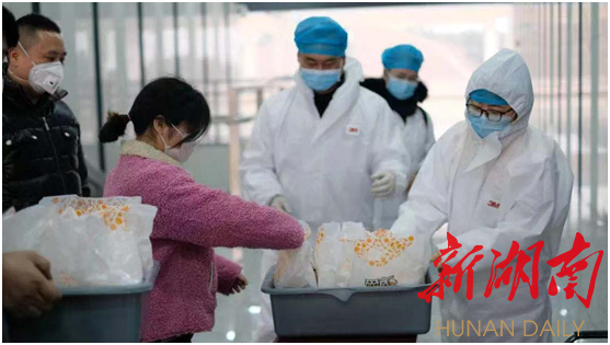 在桃源高铁站,来自县红十字会医院的庄敏芳与她的同事们正在疫情防控执勤点坚守岗位,逢人必检。临近饭点,一辆轿车来到高铁站,为工作人员送上了晚餐。