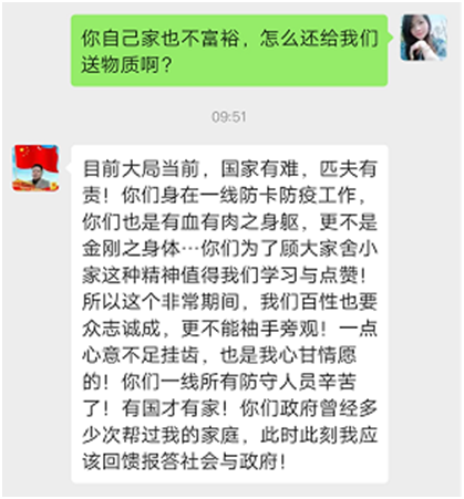 “一点心意,不足挂齿,你们守一线的工作人员辛苦了,你们政府曾经多次帮助过我的家庭,此时此刻,我应该回馈报答”,当执勤人员询问朱校军原因时,他这样回复。