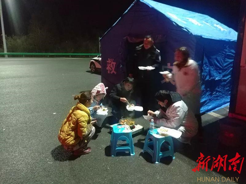 农车镇纪委书记彭刚在高速路口值守点吃”年夜饭“(张治友 摄)