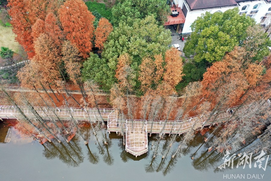On January 1, in the Forest Botanical Garden of Hunan Province, tourists took a walk under the metasequoia trees by the lake to observe the scenery.