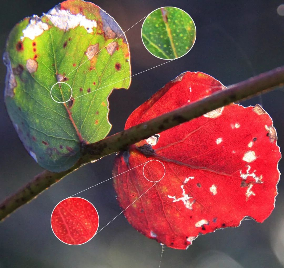 无论是活叶还是将要掉落的死叶,都清晰可见其油腺斑点。图源:Thomas Fairman