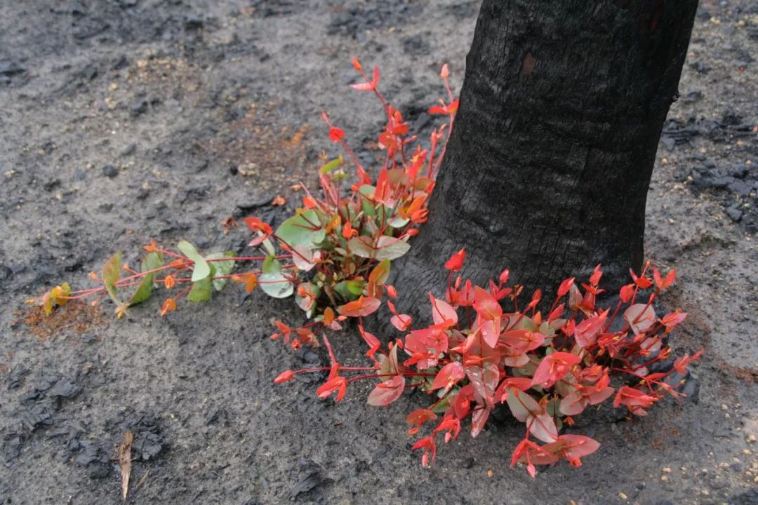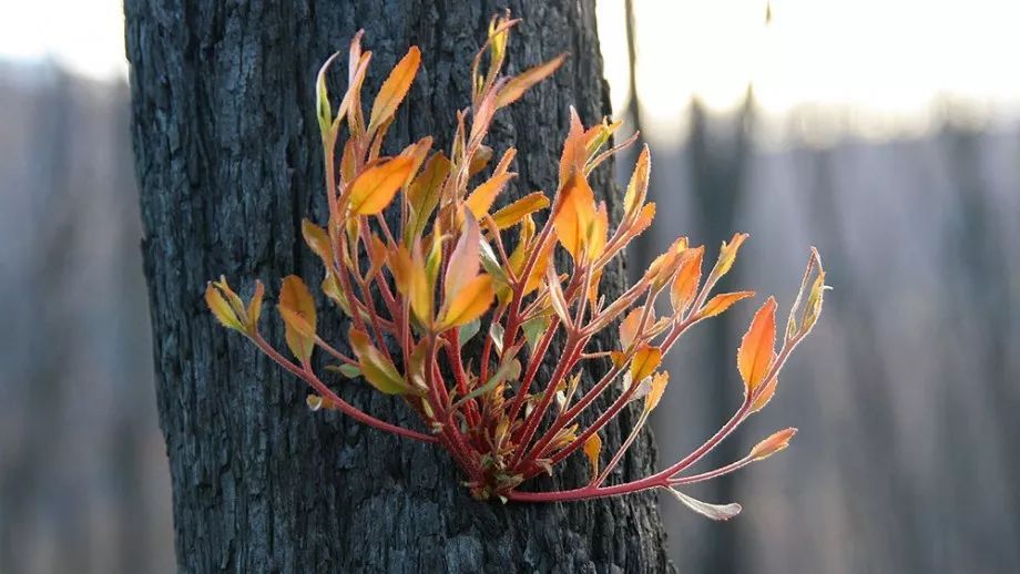 大火还没被彻底扑灭前,那些曾被火焰席卷过的土地上,桉树就已经“浴火重生”了。在原来被烧得焦黑的树干上,桉树嫩芽“破皮而出”,充满了生机。