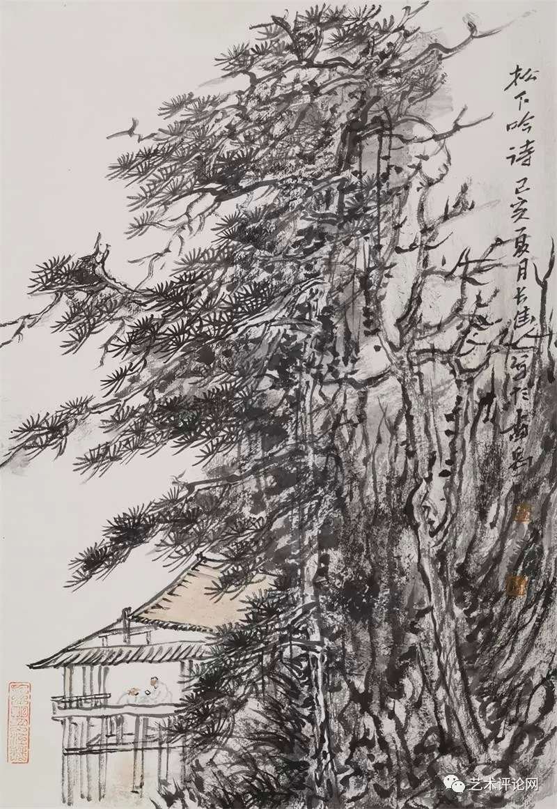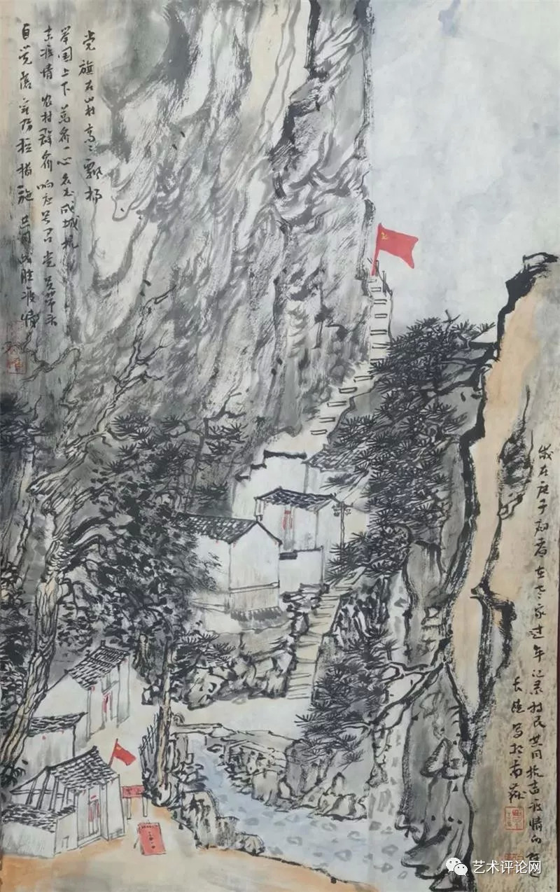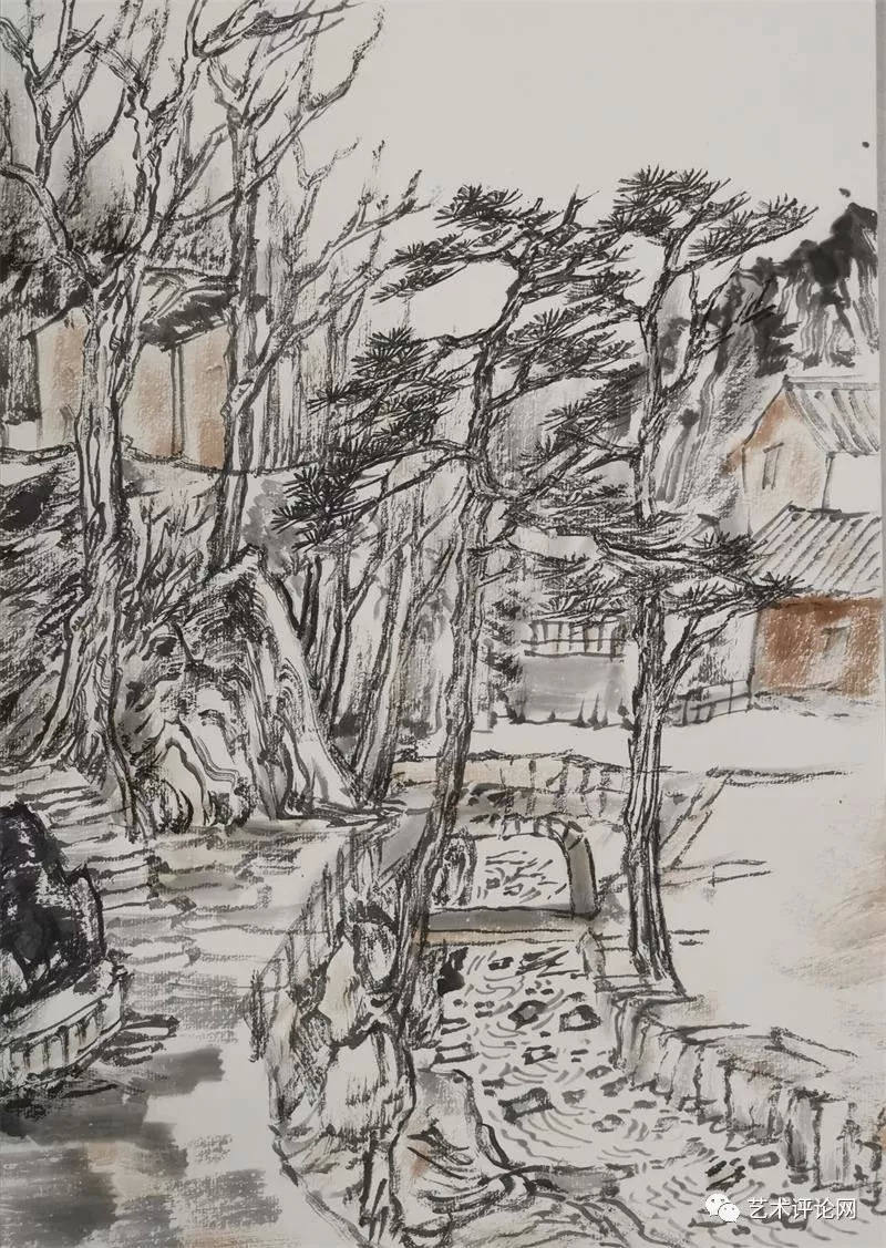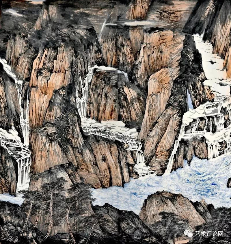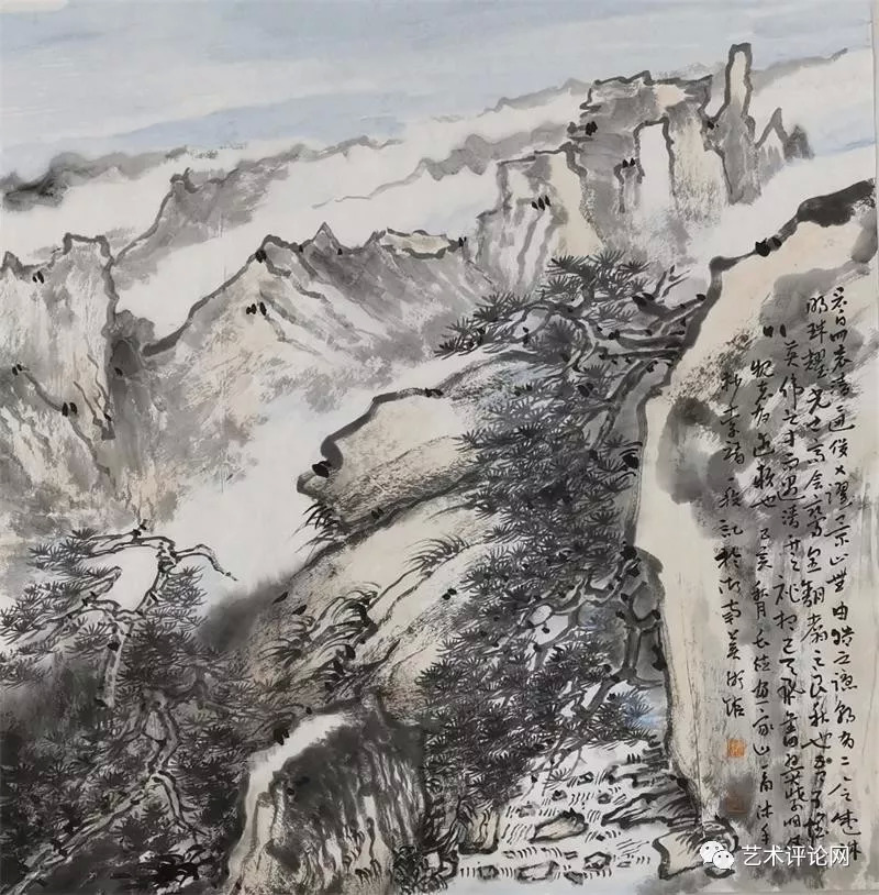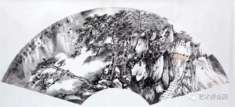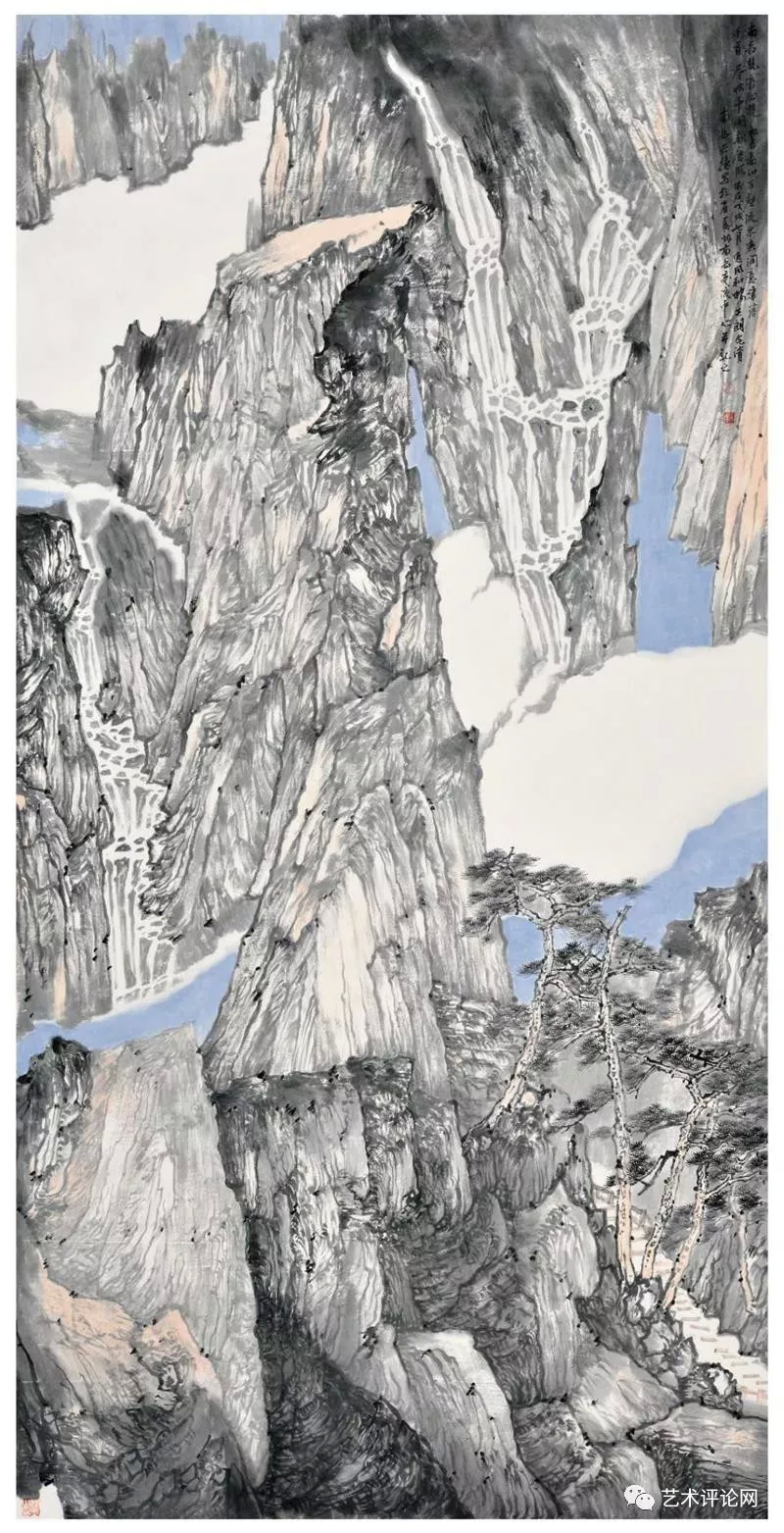 清人黄钺在《二十四画品》中将“苍润”作为画品一格。事实上,在现代汉语词典里可以寻迹出一个与“苍”有关的词族,如“苍润、苍劲、苍古、苍翠、苍茫、苍白……”。“苍”在中国传统文化观念里已经代表为一种深厚的美学观感,而“苍”之本意为一种深青、深绿、灰白的色彩,与中国画之“墨分五色说”相得益彰。在谭长德的画面里,已将南岳之秀化为“干湿浓淡焦”的墨色写就的遒劲苍松、如飞山泉、争奇群峰。道法衡山,为祖国河山立传。他心中的“天下南岳”,就此成为为祖国山川写照的起点和参照,其笔下的桂林山水、武陵风光,皆呈现出一种古厚雄健的画品格调和苍润遒劲的笔墨意趣。我们有理由相信,会有更多的烟霞之侣、山形意态将凝结成他画笔下的笔墨山川,叙述中华地望里承载的文化精神和人文故事。