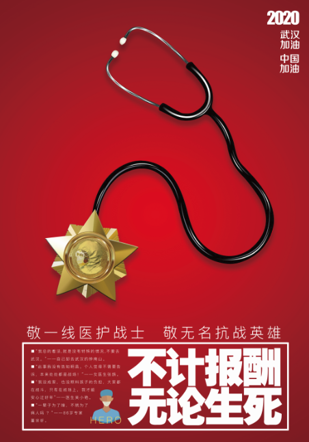 作品说明:在疫情爆发的一刻,身为最平凡的人,我们想到的是自保,是躲避,但是医护工作者站在我们的最前方,坚定的步伐踏出震撼人心的脚步,他们无惧无畏,只为守护我们的国家,守护我们,让他们忘却他们和我们一样都是最平凡的人。海报将护士作为主题,用准备奔跑的动势表达他们无畏的奉献精神,明艳的颜色显示医护工作者本身的青春洋溢,整体表达对医护工作者的感谢及尊敬。