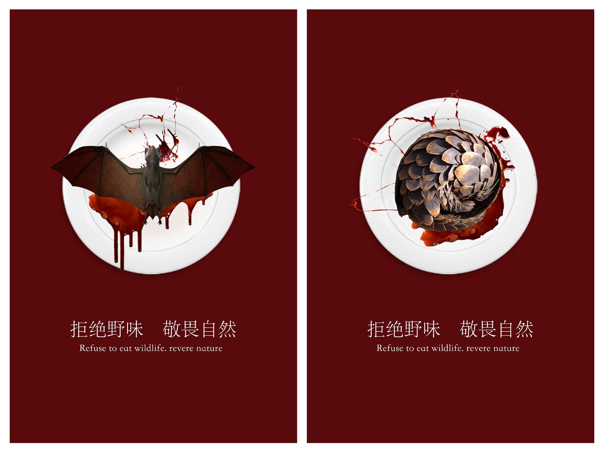 作品说明:运用蝙蝠,穿山甲作为主体置于餐盘中,呼吁人们拒绝野味,不要与自己的生命开玩笑,为一时的冲动用生命买单,拒绝野味,敬畏自然。
