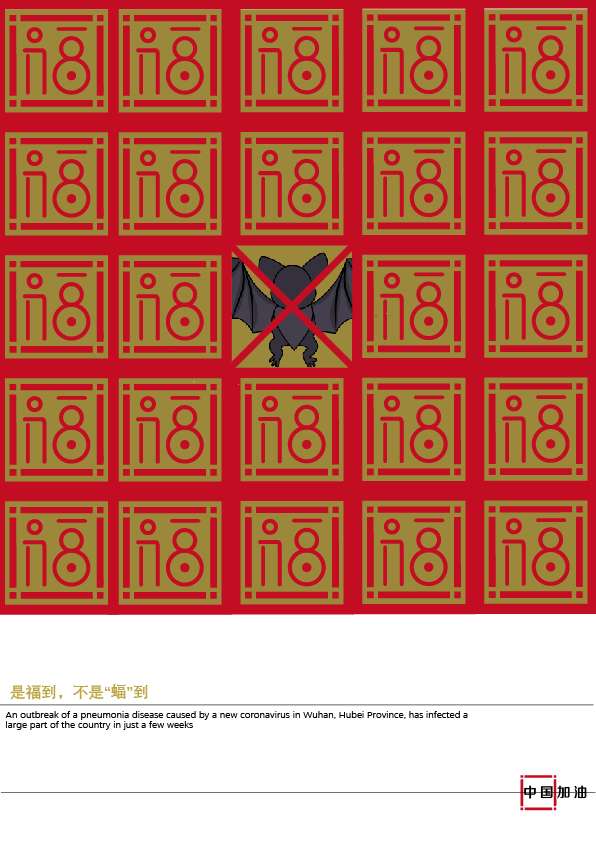 作品说明:该海报设计结合了中国传统的“福”字,此次新型冠状病毒爆发在新春佳节之际,是中国最为传统重要的节日。往年的此刻是我们贴福字,挂灯笼正张灯结彩的时候,蝙蝠在传统的中国元素中也是福寿的意思,但此次由乱食蝙蝠所引起的感染,导致人心惶惶。所以该海报主要想体现万众一心集大众之福,抵抗病毒,让蝙蝠的美好意向重回福寿齐天之中,作品名为守护,也希望大家能够守住福气,借此号召大家敬畏自然,崇尚自然,不要乱食野味。